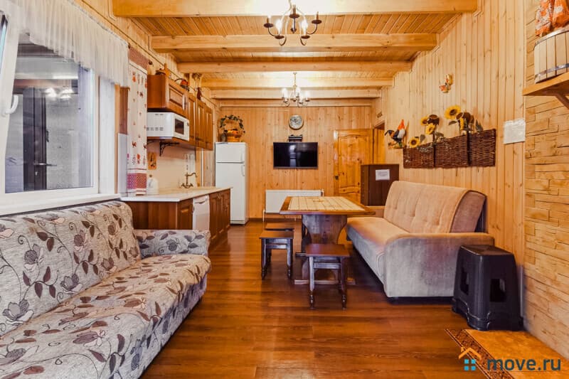 1 этаж: прихожая с гардеробом; кухня-гостиная 50 кв.м с камином, раскладными диванами, спутниковым ТВ, караоке, стереосистемой, Wi-Fi и настольным теннисом; кухня с холодильником, газовой плитой с духовкой, микроволновкой, чайником, тостером, посудомоечной машиной и посудой; спальня с двуспальным диваном; санузел с душем и стиральной машиной.