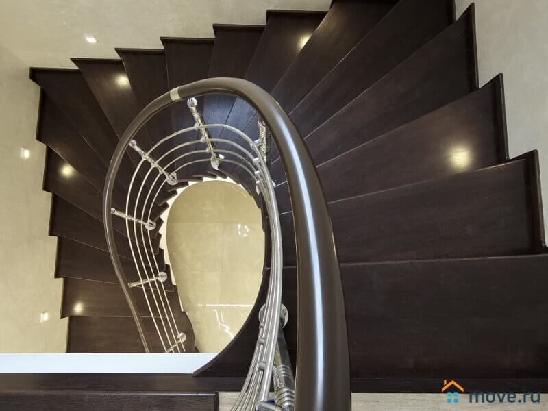 Фундамент - железобетонная плита 300 мм., как и межэтажное перекрытие. Грациозная винтовая лестница на 2-й этаж тоже железобетонная, ступени, покрыты красивым красным дубом.