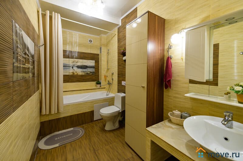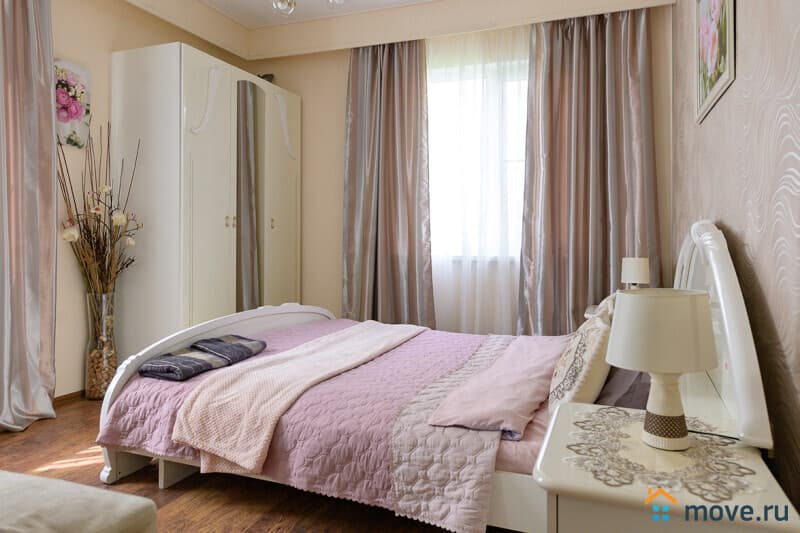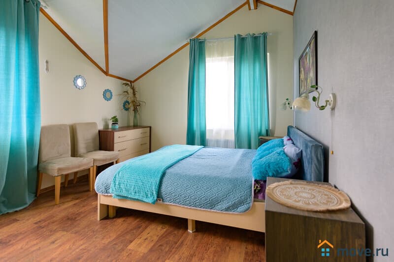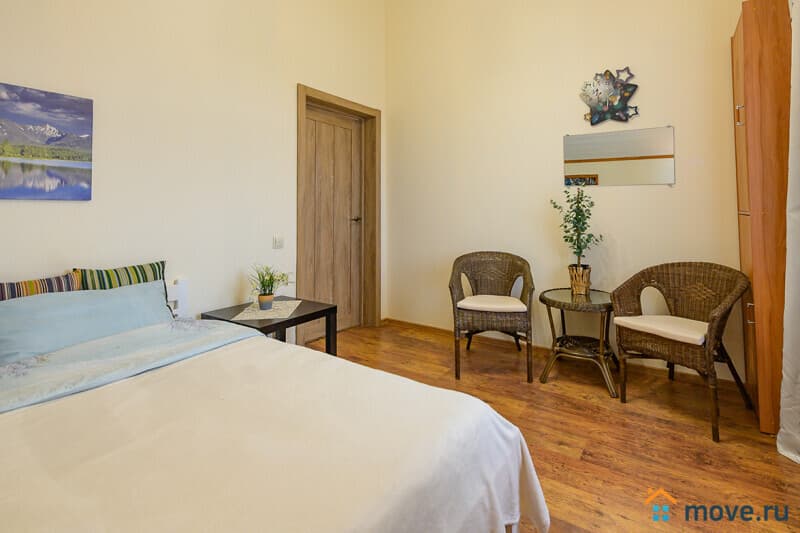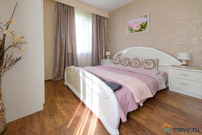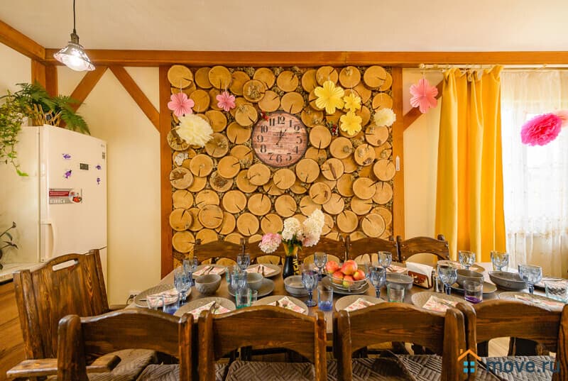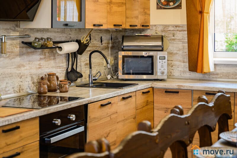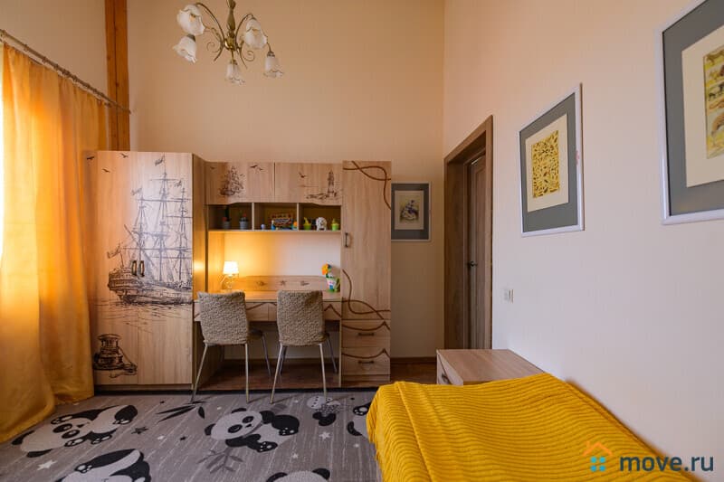 1 этаж : прихожая; кухня-гостиная 35 кв.м с тахтой, электрокамином, Smart TV, Wi-Fi; кухня со столом на 18 персон, холодильником, варочной панелью, духовкой, микроволновкой, кофемашиной, ПММ, кулером с питьевой водой, посудой; спальня с двуспальной и односпальной кроватями; санузел с ванной.