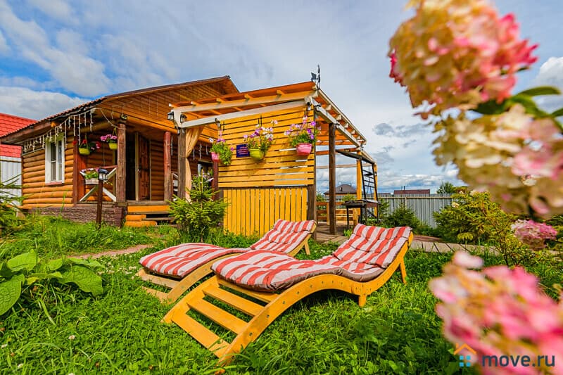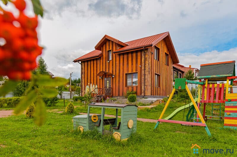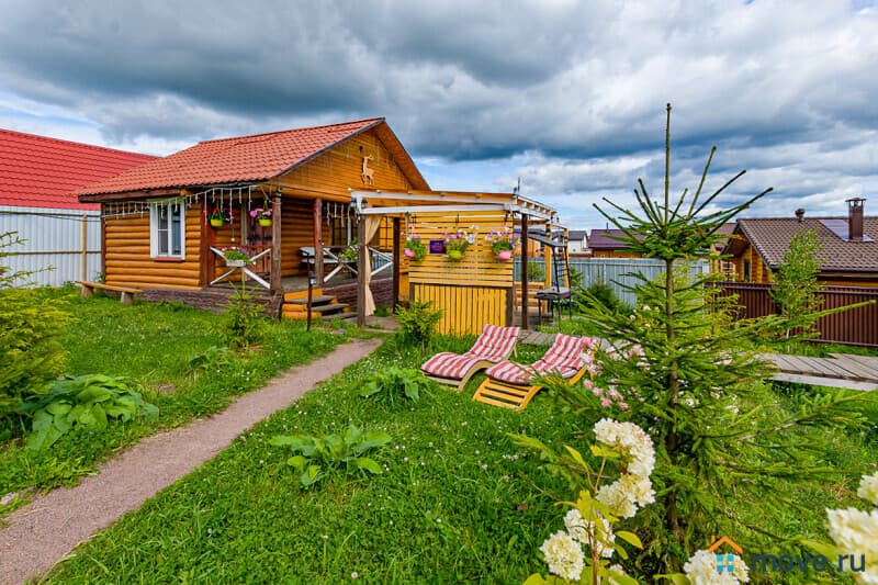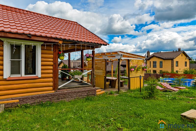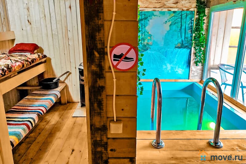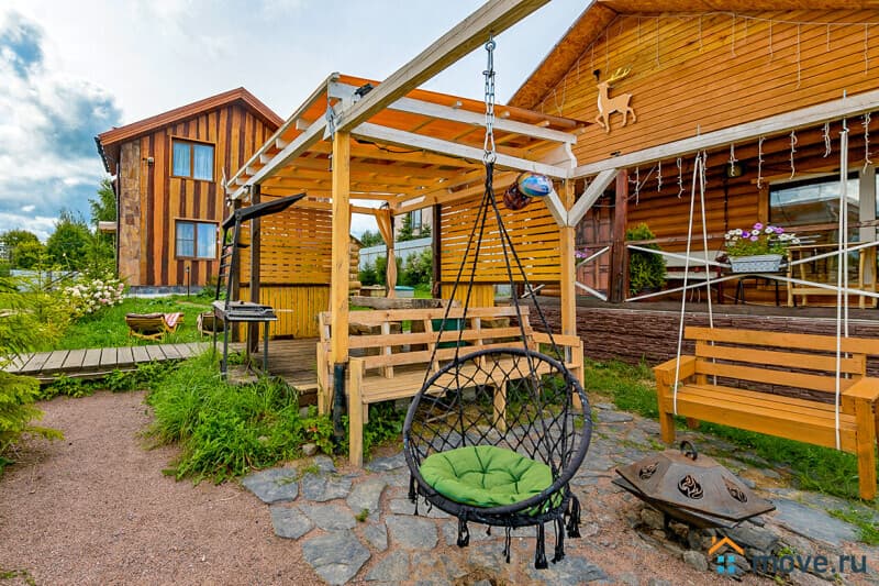 Участок 15 соток: баня из белой осины с комнатой отдыха (18 кв.м, стол на 15 гостей, душ, чайный набор, холодильник для напитков) и теплой купелью 2?2 м, глубина 1,5 м, с подсветкой и панорамными окнами (баня с купелью — 9 000 руб/3 ч, далее 1 500 руб/ч); терраса с ротанговой мебелью и цветами; летний бассейн диаметром 5 м, глубина 1,35 м (включен в аренду); паттио в стиле старинного замка — крытый мангал, костровая зона на 14 человек, качели, еловое обрамление; детская площадка с горками, качелями и подсветкой; парковка на 6 авто; освещение по периметру с датчиками движения.