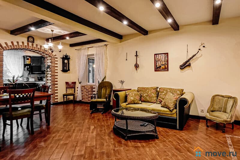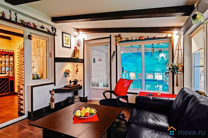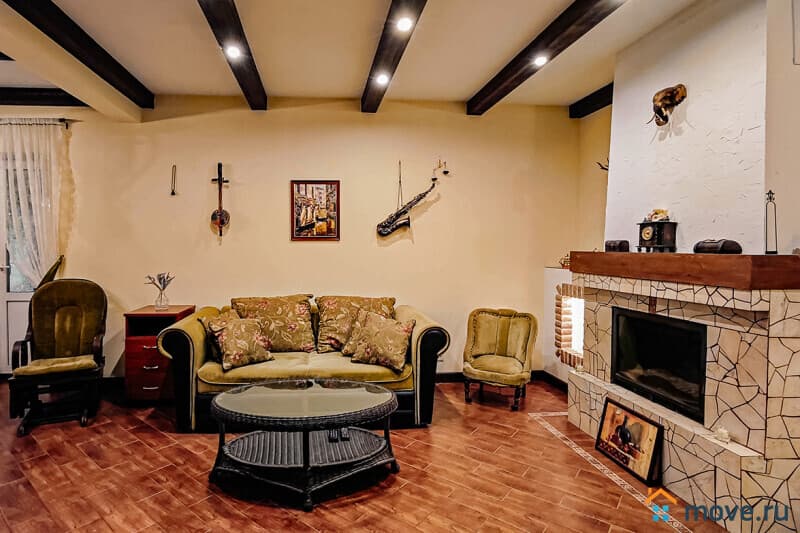 -1 этаж (оборудован тёплыми полами): просторная гостиная с камином(дрова для камина — за отдельную плату или можно привезти с собой), кухня, банный комплекс с бассейном и сауной (банный комплекс включён в стоимость аренды дома, в сауне нельзя париться с вениками), санузел с душем;