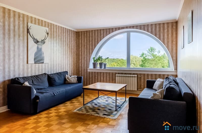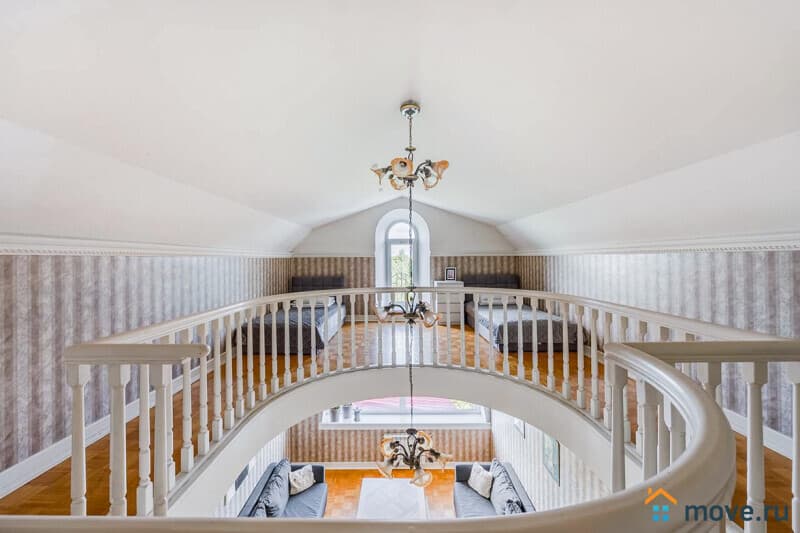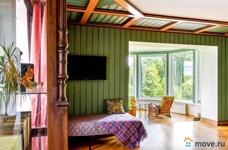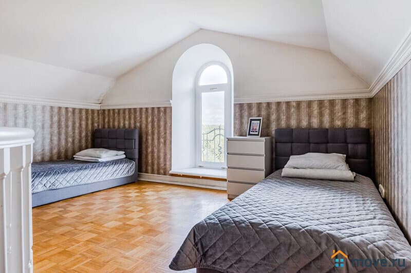 3?й этаж: 3?спальни (в двух — односпальные кровати, в третьей — двуспальная с панорамным окном), проходная спальня (два двуспальных дивана), ванная, 2?санузла;
