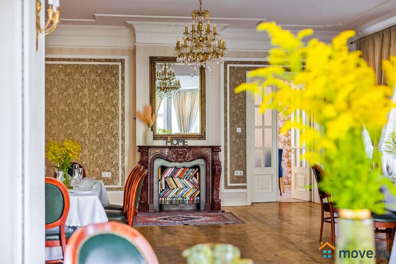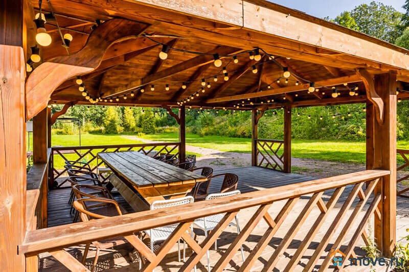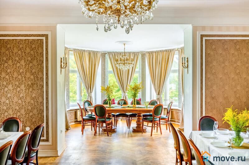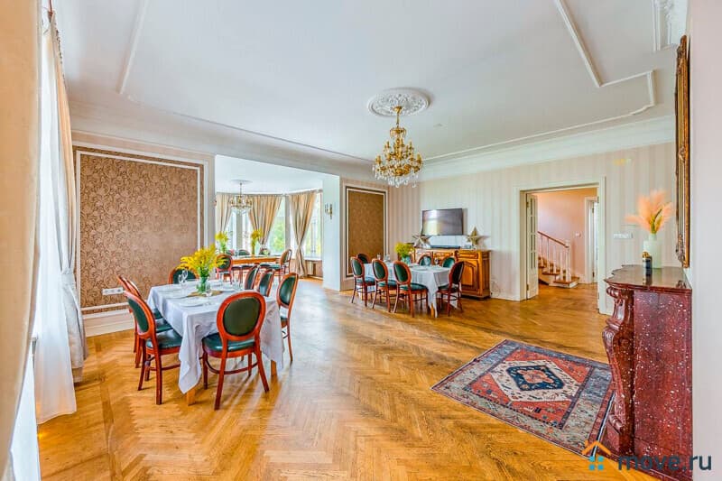 1?й этаж: прихожая с парадной лестницей, кухня (стол на 10?гостей, вся техника), банкетный зал 65?кв.?м (камин, дубовый стол на 15?персон; вмещает до 40?гостей);