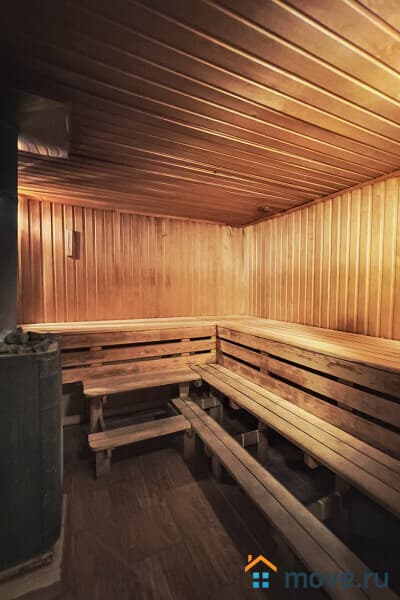 Цокольный этаж: холл 60 кв.м. с камином и диваном, сауна на 8 человек и бассейн 4?8 м с панорамными окнами (сауна и бассейн — 10 000 руб./сутки, дрова 500 руб.), раздевалка, душевые и санузлы.