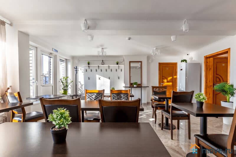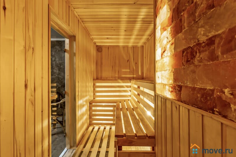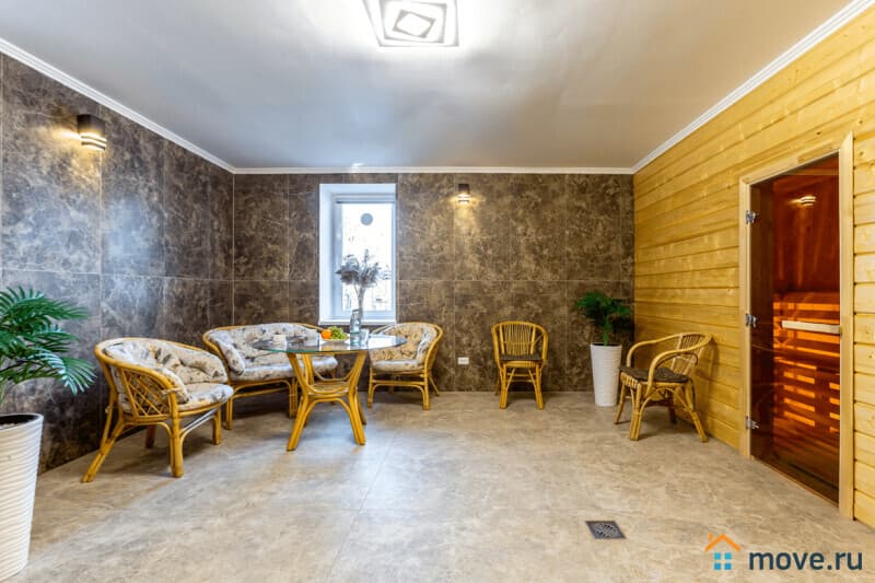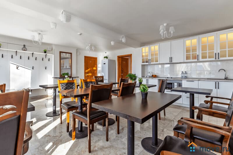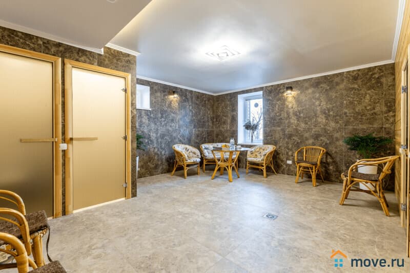 1 этаж: зал-кухня 40 кв.м в стиле кафе, рассчитанный на 24 персоны, Smart TV, Wi-Fi; кухня с холодильником, плитой, чайником, микроволновкой и посудой; гостевой туалет; СПА-зона с гималайской сауной и комнатой отдыха с душем и туалетом (сауна оплачивается отдельно — 3 000 руб./2 ч, далее 1 500 руб./ч).