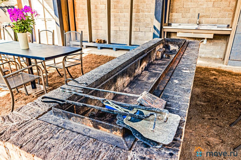 — просторная беседка со столами на 18 человек, мойкой, зоной приготовления и большим мангалом (шампура и решётки включены, уголь и розжиг с собой или за отдельную плату);