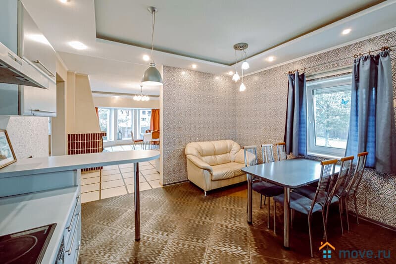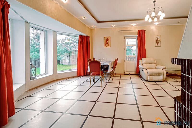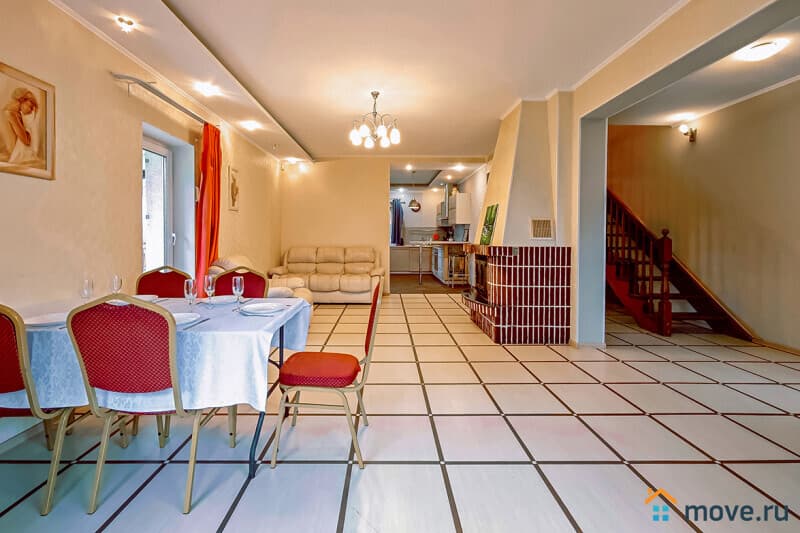 1 этаж: гостиная с камином (дрова — 600 руб./сетка), панорамными окнами, столами на 20 человек, выход на крытую террасу; кухня с техникой; зал с бильярдом и аудиосистемой; санузел с душем; тёплые полы.