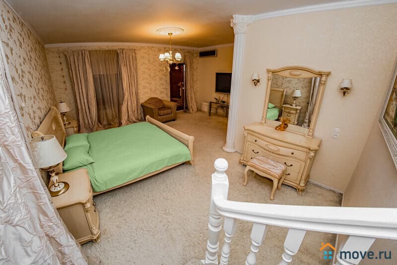 2 этаж: спальня с двуспальной кроватью, креслом, Smart TV, балконом и санузлом; две спальни с двуспальными кроватями; спальня с двуспальной и односпальной кроватями; санузел с ванной, душем, биде и феном.