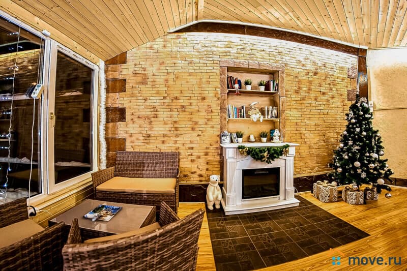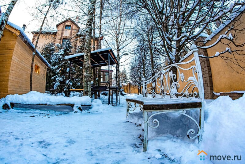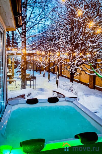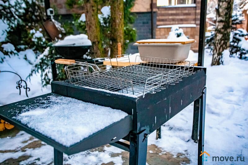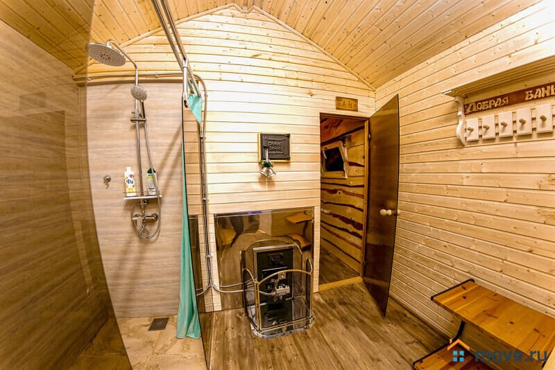 На участке 10 соток: баня на дровах в стиле «Леший» с душевой, обливным ведром и застеклённой верандой с камином, столом на 18 человек, Smart TV, караоке и выходом на террасу с круглогодичной горячей ванной с аэромассажем и подсветкой. Крытая зона барбекю с мангалом, печью, раковиной (дрова и шампура включены, уголь за отдельную плату). Парковка на 6 авто под видеонаблюдением.