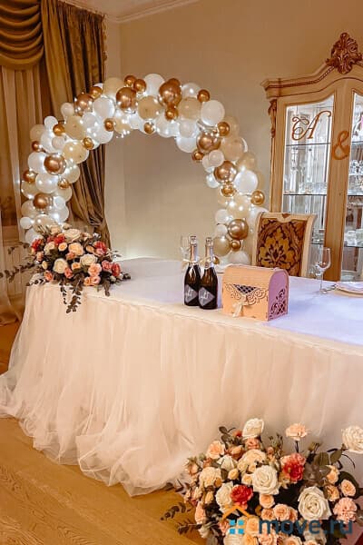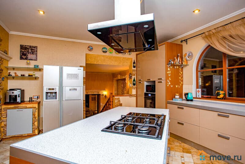 1 этаж: прихожая, банкетный зал 80 кв.м. с камином и столами на 30 персон, гостиная-кухня 70 кв.м. с барной стойкой, столом на 8 человек, диваном и Smart TV. Кухня оборудована островом, газовой плитой, холодильником, духовкой, посудомоечной машиной, кофемашиной, чайником и посудой. Санузел.