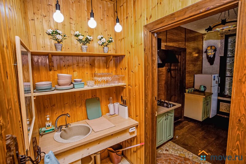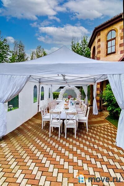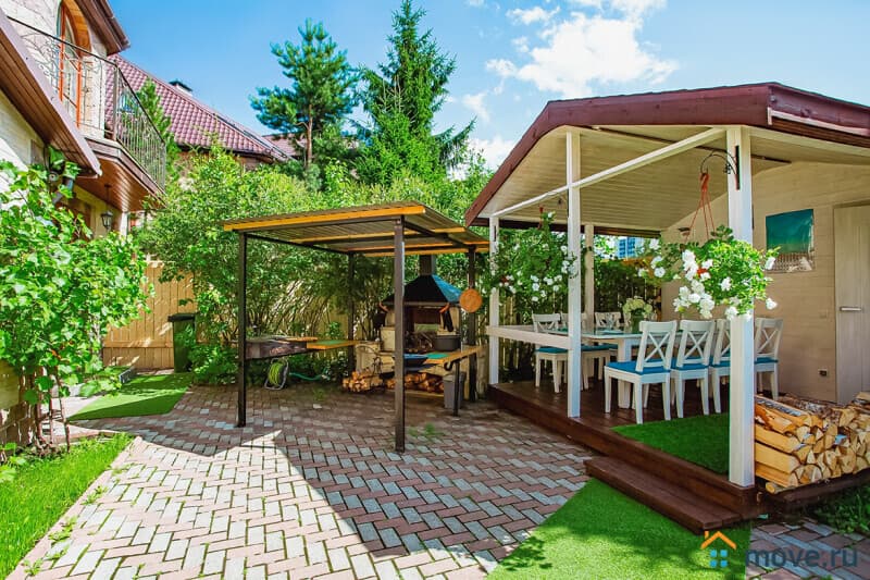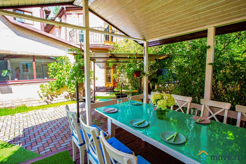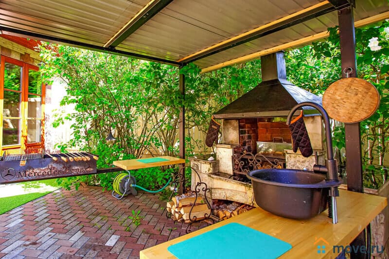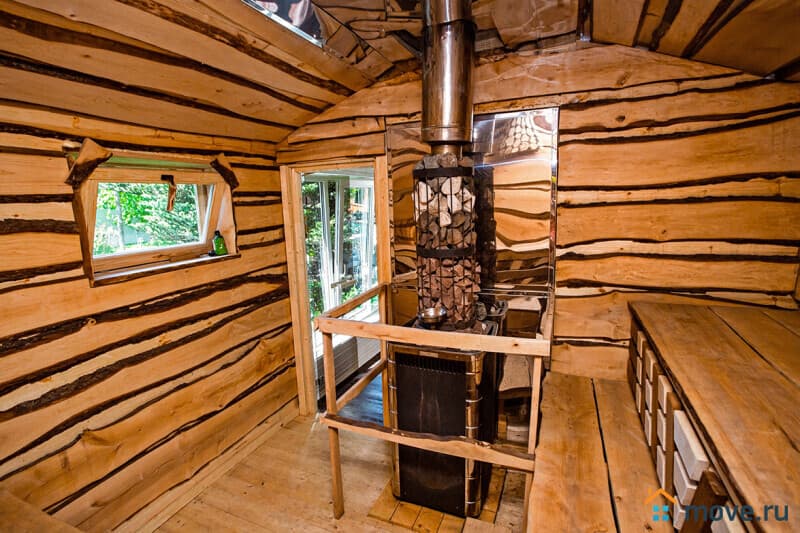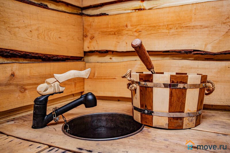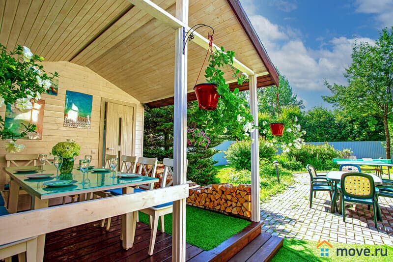 На участке 10 соток: баня на дровах с душевой (входит в стоимость), крытая зона барбекю с мангалом, печью, раковиной, решётками и дровами (уголь и розжиг за отдельную плату), летний шатёр, теннисный стол, освещаемая территория с садом и песочницей, парковка на 6 машин (плюс 4 рядом).
