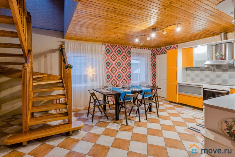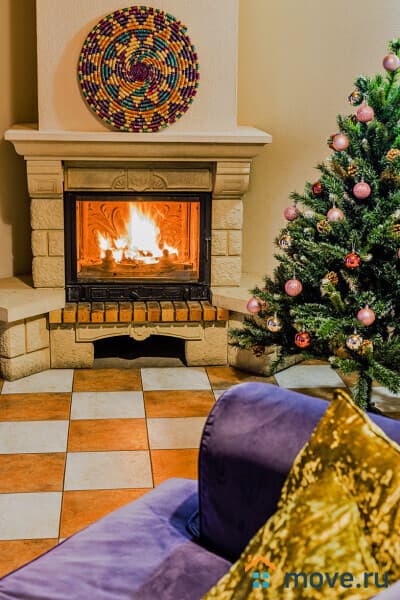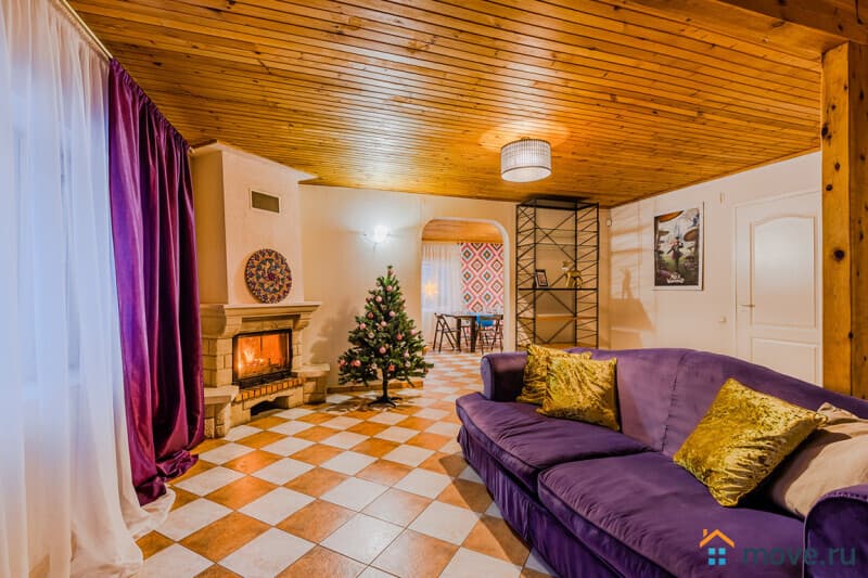 1 этаж: гостиная с камином, большим двуспальным диваном, ТВ, саунд-баром и Wi-Fi; кухня-столовая с холодильником, плитой, чайником, посудомоечной машиной и раскладным столом; спальня с двуспальным диваном; санузел с душем.