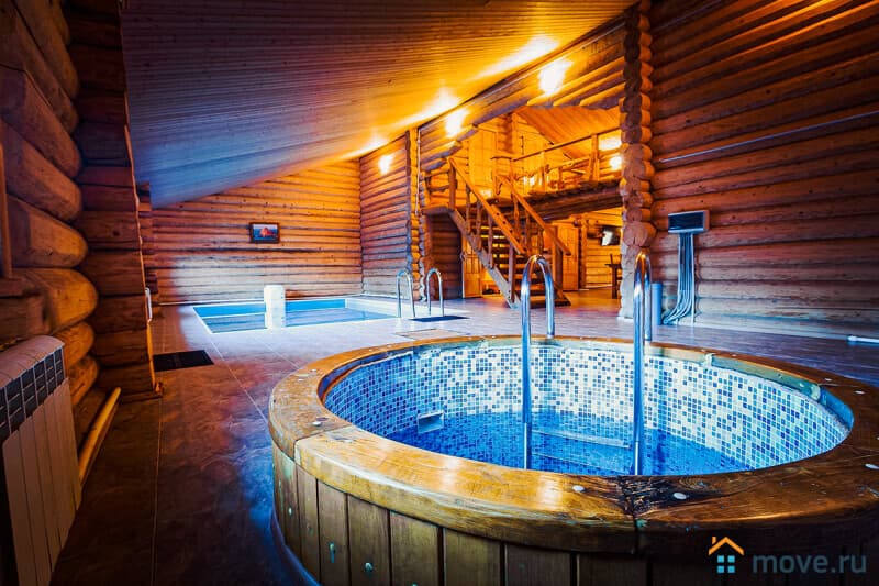 Банный комплекс — отдельное здание на 15 гостей: русская парная, бассейн, купель, бильярд, стол, мини-кухня, мангал и беседка. Стоимость: 10 000 ? за 2,5 ч, далее 2 500 ?/ч (ночью 3 000 ?/ч). Включено 12 простыней.