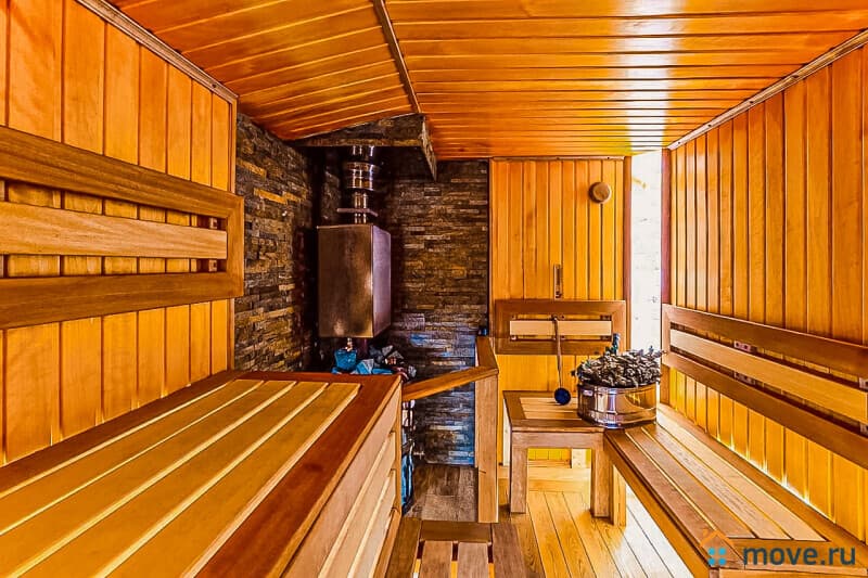 В бане: комната отдыха со столом, стульями, диваном и ТВ; парилка; душевая и санузел.