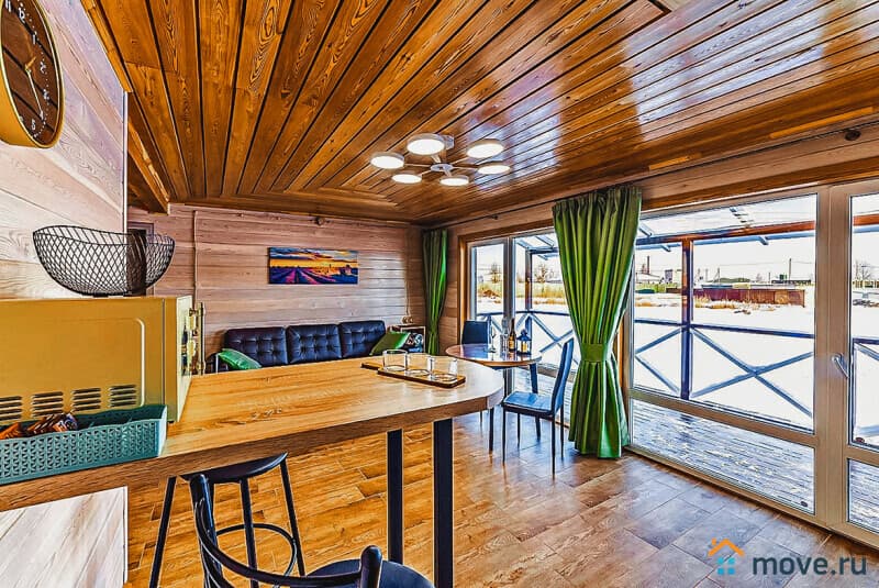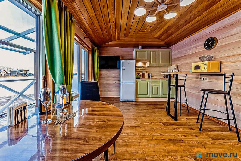 1 этаж: прихожая с гардеробом; гостиная-кухня площадью 24 кв.м. с панорамными окнами и выходом на крытую террасу с видом на воду; гостиная с столом на 6–8 персон, раскладным диваном (2–4 спальных места), ТВ с подпиской на Окко, караоке и Wi-Fi; кухня оборудована холодильником, индукционной плитой, микроволновой печью, чайником, посудой и питьевой водой из скважины; две спальни с двуспальными кроватями, есть детская кроватка; санузел и душевая.