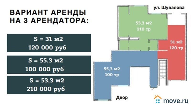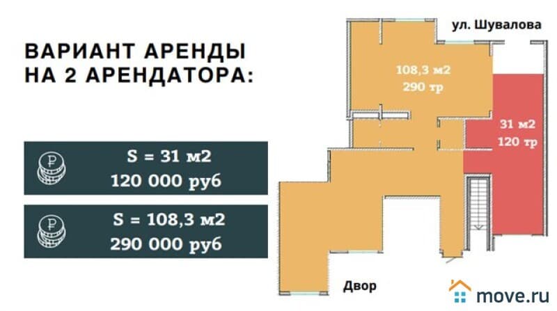 Прогнозируемая окупаемость инвестиций начинается от 7,5 лет. Помещение обладает гибкой планировкой и может быть эффективно разделено для сдачи в аренду нескольким арендаторам. Доступны различные варианты аренды: на одного арендатора вся площадь за 380 000 рублей в месяц, на двух арендаторов с площадями 108,3 м2 и 31 м2 за 290 000 и 120 000 рублей соответственно, или на трех арендаторов с площадями 55,3 м2, 53,3 м2 и 31 м2 за 100 000, 210 000 и 120 000 рублей в месяц.