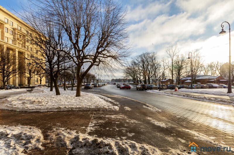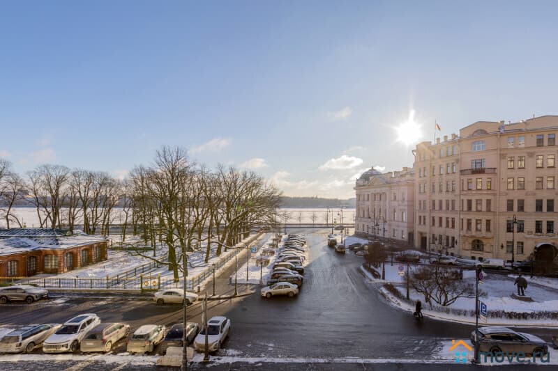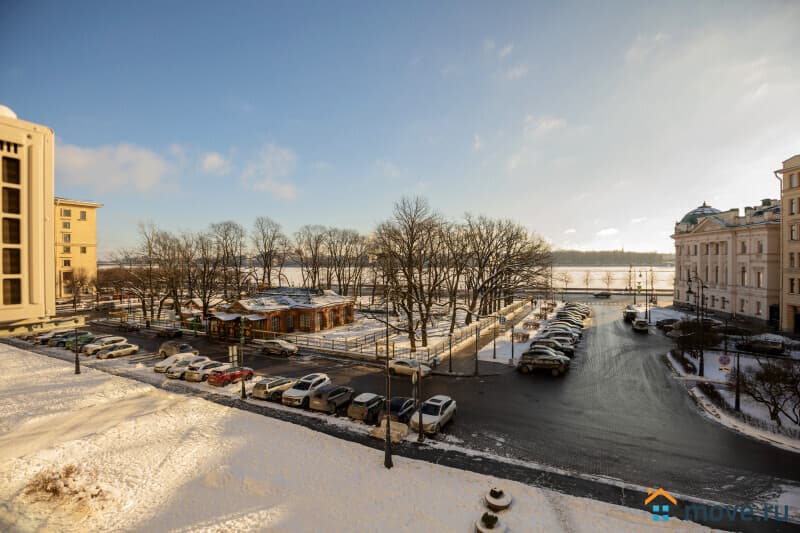 Предлагаем к продаже великолепную 3к квартиру в этом доме. Общая площадь 98,2 кв.м. Квартира двухсторонняя. Окна двух изолированных комнат, площадью 18,2 и 16 кв.м выходят в просторный двор, а два больших "французских" окна в пол с маленькими балкончиками в гостиной, площадью 30,5 кв.м - на Петровскую набережную и Домик Петра. В квартире большая кухня 12 кв.м, два санузла, прихожая почти 14 кв.м.