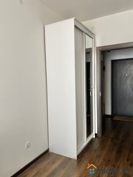 В комнате установлена встроенная качественная кухня с техникой, распашной шкаф, компактный диван, который раскладывается. Также есть обеденная зона со столом и стульями.