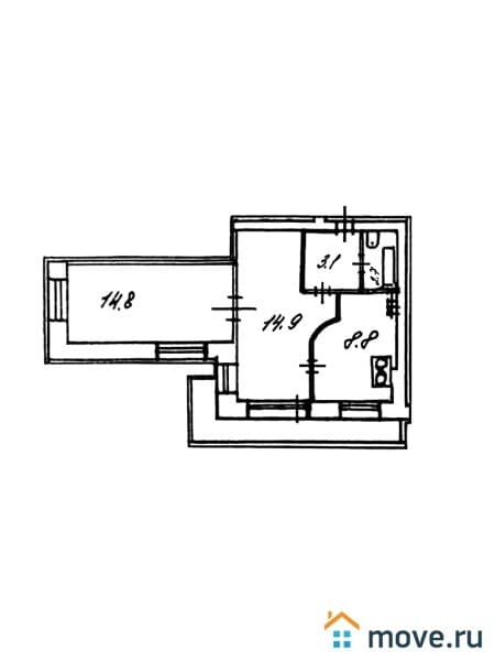 Квартира имеет две жилые комнаты площадью 14,9 м2 и 14,8 м2, кухню 8,8 м2,