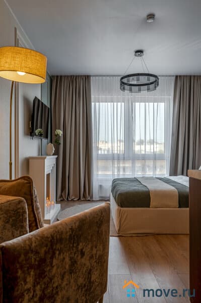 Стильная студия с дизайнерским интерьером в современном жилом комплексе — идеальный вариант для комфортного проживания в центре Санкт-Петербурга. Уютное пространство продумано до мелочей: спокойные природные оттенки, мягкое освещение, декоративный камин и удобная планировка создают атмосферу отдыха и уюта.