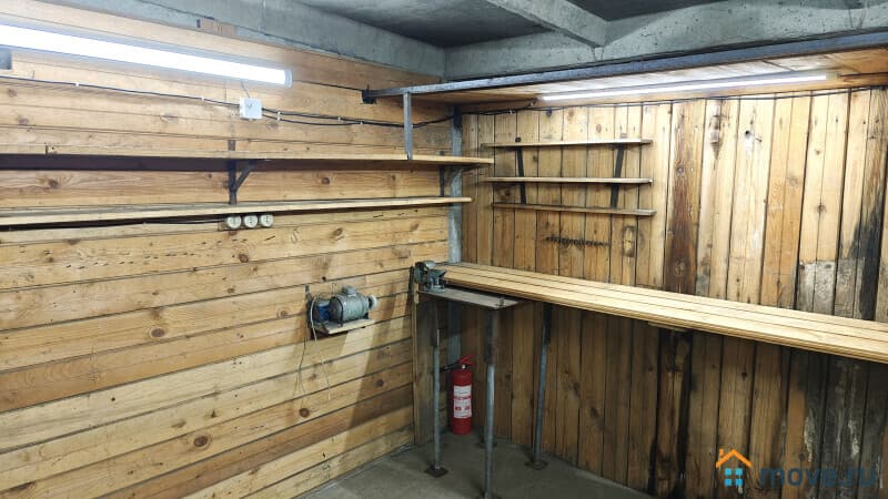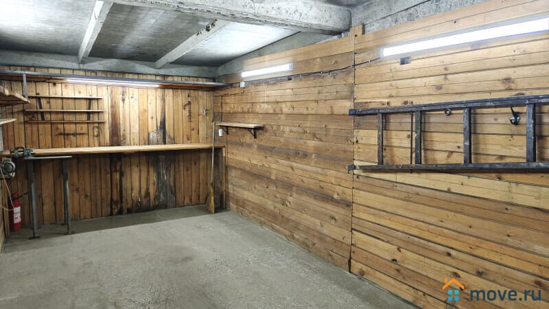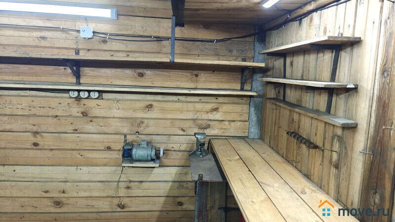 В гараже есть небольшой верстак, тиски, наждак, много полок, есть полка над входом для колес и прочего, лестница.