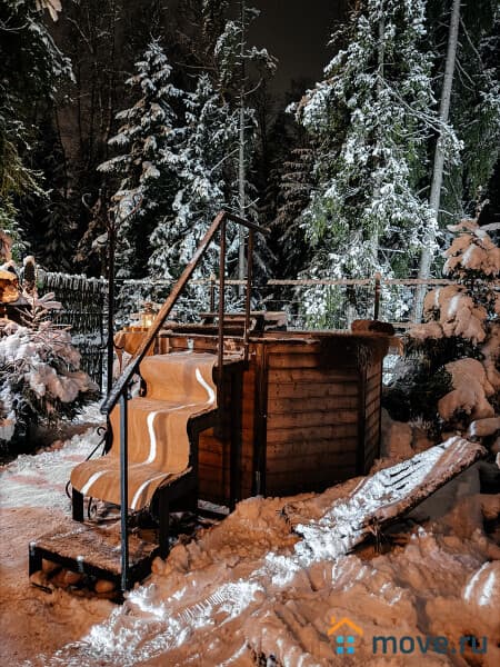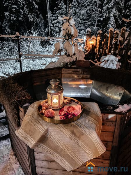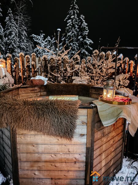 На территории, прямо у леса есть баня-бочка, купель и чан с горячей артезианской водой. Все для полноценного SPA.