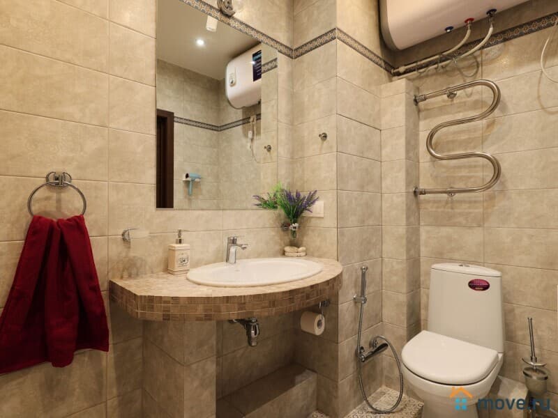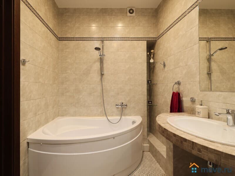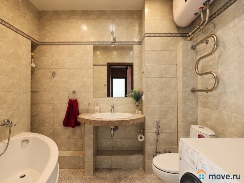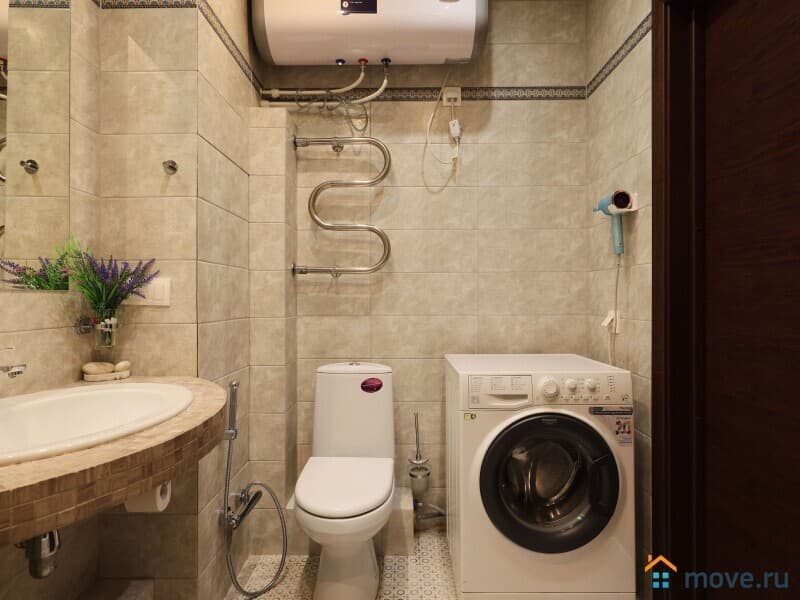 Кухня полностью оснащена всей необходимой техникой, включая посудомоечную машину — чтобы вы тратили время на отдых, а не на бытовые заботы. В квартире также есть стиральная машина и большая ванная комната, где приятно расслабиться после насыщенного дня.