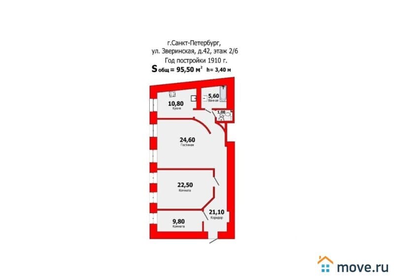 Квартира площадью 95,5 кв. м расположена на втором этаже шестиэтажного кирпичного дома 1910 года постройки. В доме есть лифт. Окна выходят во двор, где всегда тихо и спокойно.