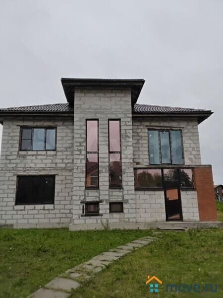 Дом на монолитной плите, стены газобетон, высокие потолки, панорамные окна, двухкамерные стеклопакеты, отопление газовый котел и радиаторы, теплые полы.