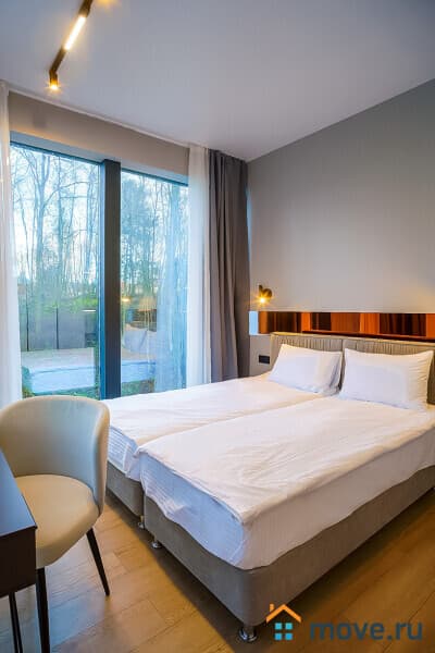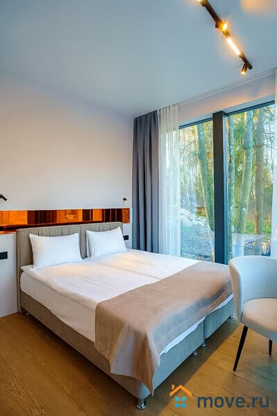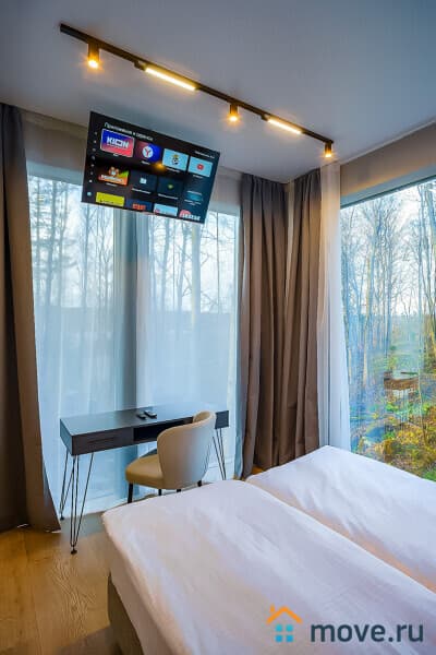 Спальня с панорамными окнами, двуспальной кроватью с ортопедическим матрасом, Smart TV и шторами блэкаут.