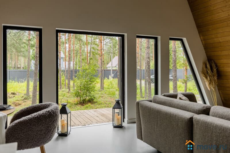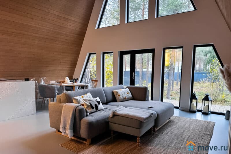 Сдается в посуточную аренду самый крупный A-frame коттедж в Ленинградской области. Архитектурный шедевр с геометричным силуэтом, где шестиметровые потолки, второй свет и панорамные окна создают эффект пространства и света. Дом расположен на опушке соснового леса, всего в 20 км от КАД — идеальный баланс уединения и доступности.