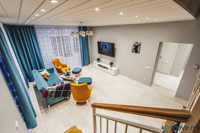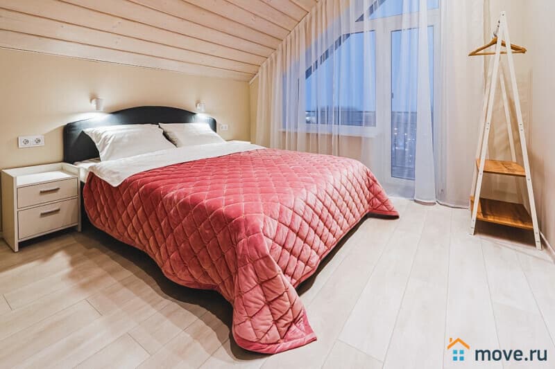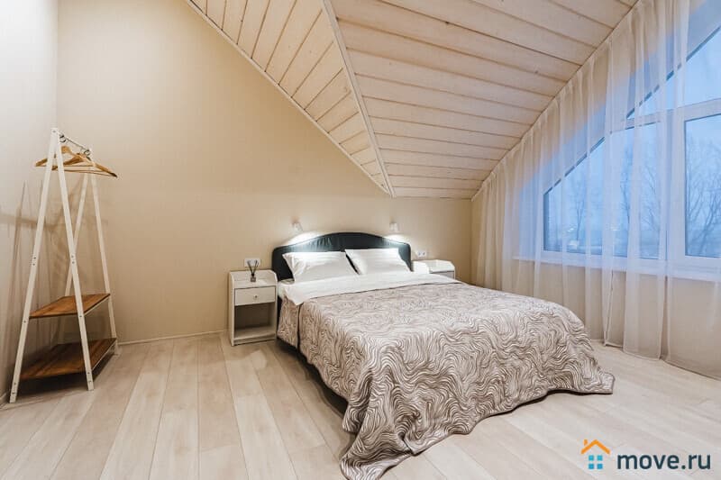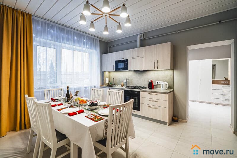 1 этаж: прихожая с гардеробом; гостиная 30 кв.м с раскладным диваном, двумя креслами, пуфиками, Smart TV, Wi-Fi, настольные игры; кухня 15 кв.м (холодильник, газовая плита, духовой шкаф, СВЧ, чайник, кофеварка, ПММ, посуда на 10, обеденный стол и стулья); спальня с двуспальной кроватью (ортопедический матрас); санузел с гигиеническим душем.