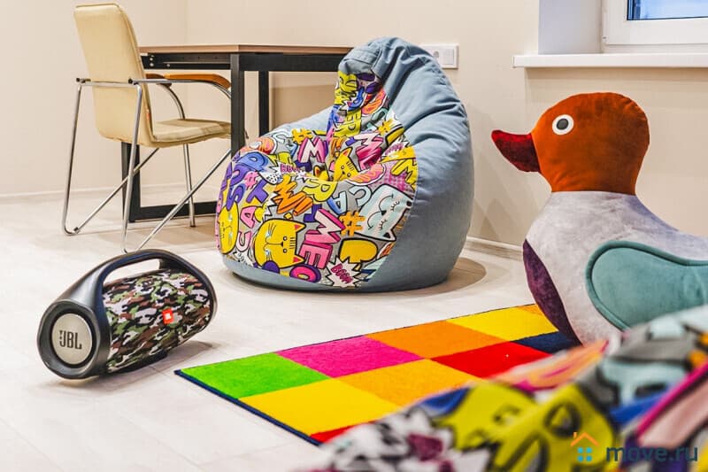 2 этаж: детская игровая; 2 спальни с выходом на балконы (двуспальные кровати, ортопедические матрасы); 1 спальня с двуспальной кроватью; санузел с душем, гигиеническим душем, феном и стиральной машиной. Для малышей: детская кроватка, стульчик для кормления, коляска-лежак.