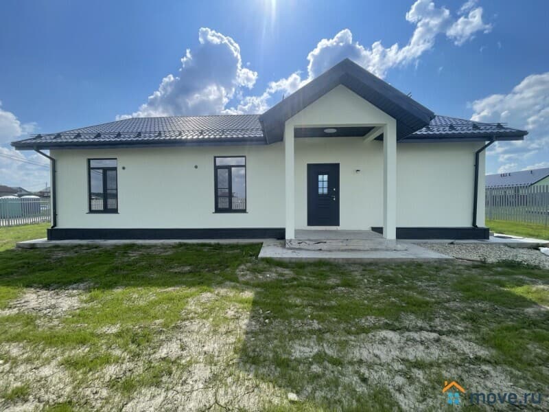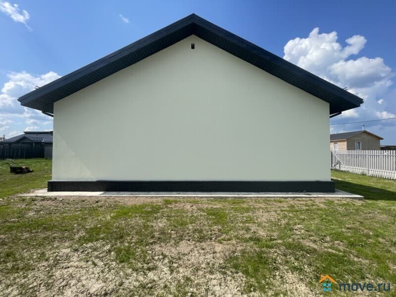 ? Одноэтажный, новый дом цвета "Зефир", с отделкой, сауной и вторым светом, из газoбетона (газоблоков) для круглогодичного проживания с террасой в коттеджном поселке "Поместье Алексеевское", на участке 12,58 соток в Ломоносовском районе.